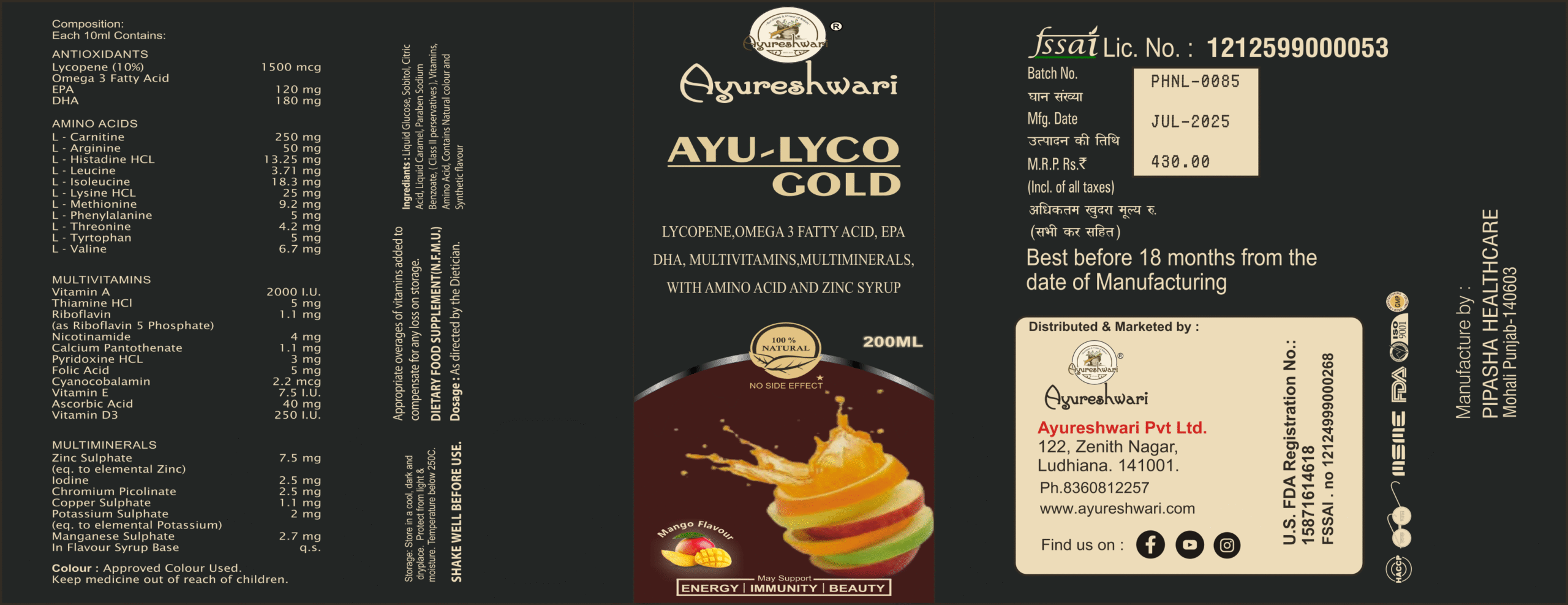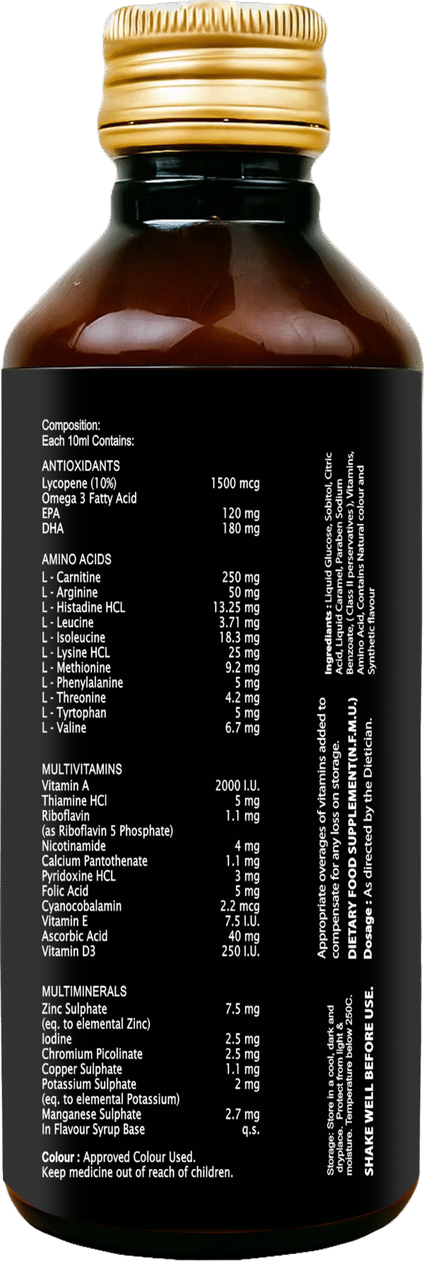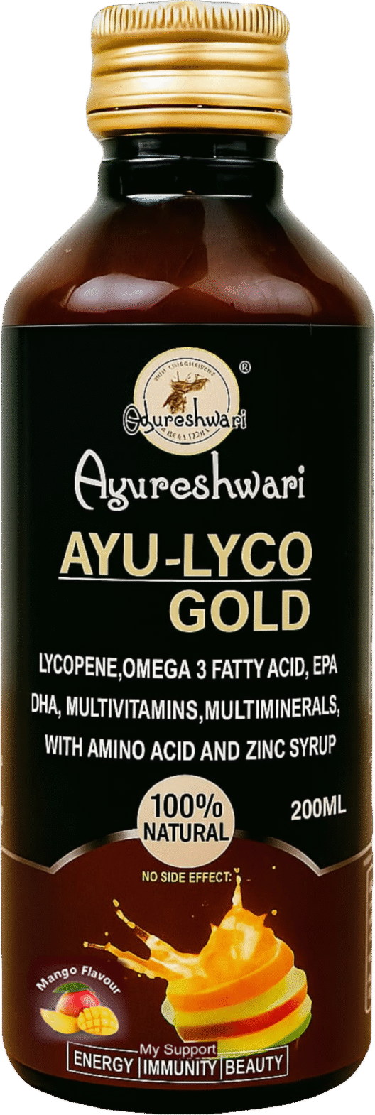 Ayu Lyco Gold is a powerful herbal multivitamin syrup enriched with natural antioxidants, essential vitamins, and rejuvenating herbs. It helps combat weakness, fatigue, and stress while improving stamina, immunity, and overall vitality.