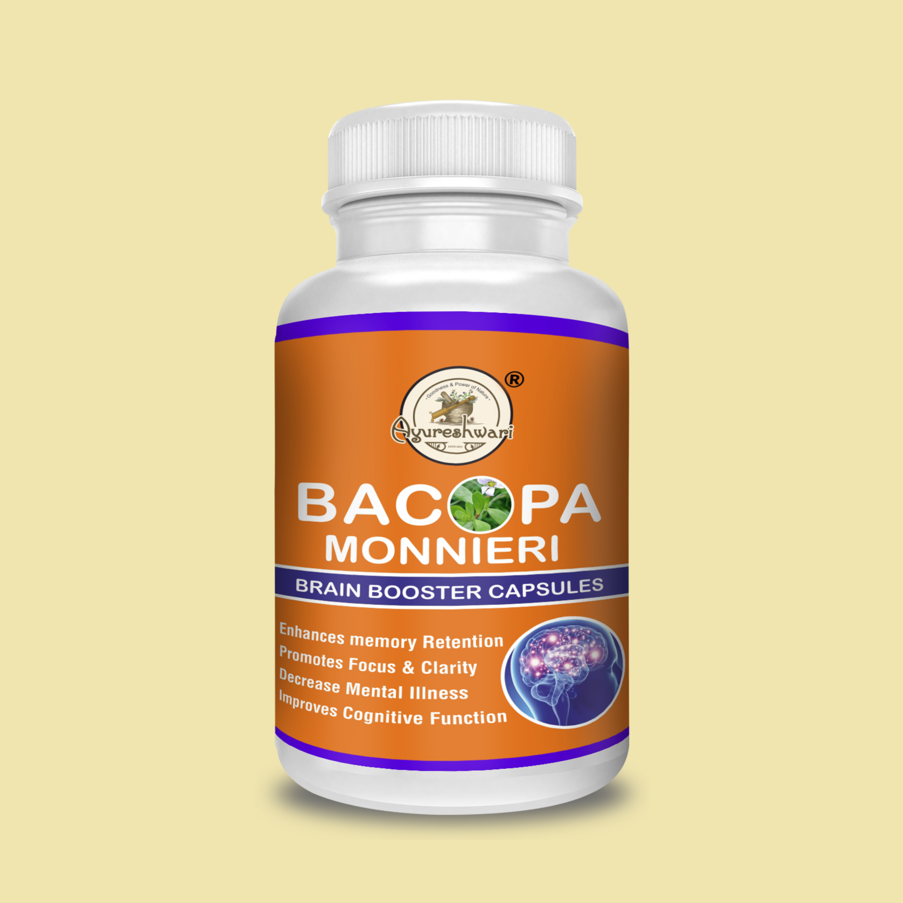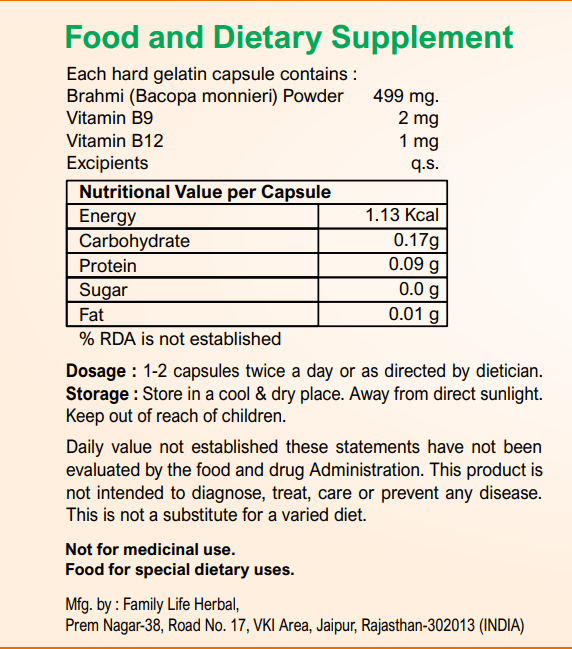 Each soft gelatine capsules contains Brahmi extract 499 mg, Vitamin B9 2000 mcg Vitamin B12 1000 mcg.