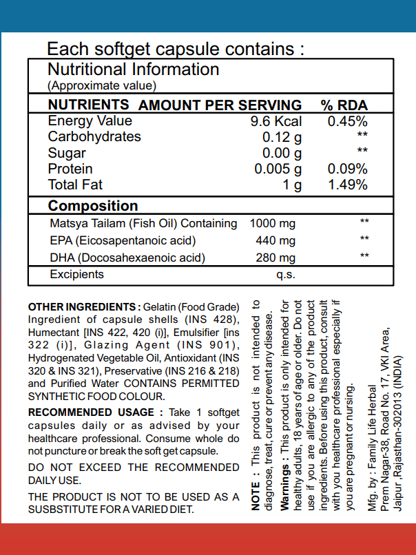 Contains – Ayureshwari Omega-3 Fish Oil contains 1000 mg Fish Oil, EPA (eicosapentaenoic acid) 440 mg, DHA (docosahexaenoic acid) 280 mg, and Omegas/Fish oil 280 mg.