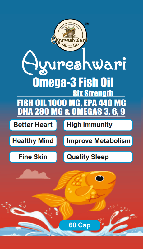 Special – Ayureshwari Omega-3 Fish Oil with High quality of EPA (eicosapentaenoic acid) 440 mg and DHA (docosahexaenoic acid) 280 mg gives you 6 layer strength of better heart, healthy mind, fine skin, high immunity, improved metabolism and quality sleep.