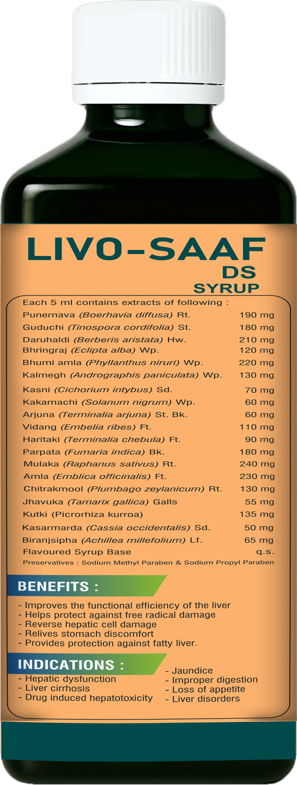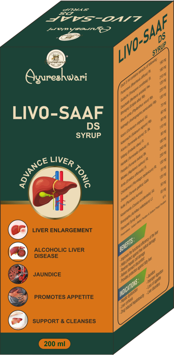 Support your liver health naturally with Ayureshwari Livo-Saaf DS Syrup, a powerful Ayurvedic formulation designed to detoxify, protect, and strengthen the liver. Enriched with time-tested herbs, it helps in managing fatty liver, jaundice, and alcoholic liver disorders, while improving digestion and appetite.