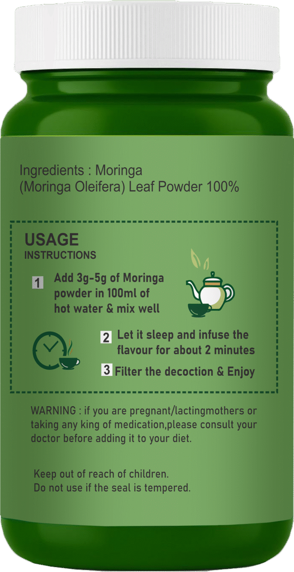 Perfect for smoothies, teas, soups, or health blends, our moringa powder is vegan, gluten-free, and free from additives or preservatives.