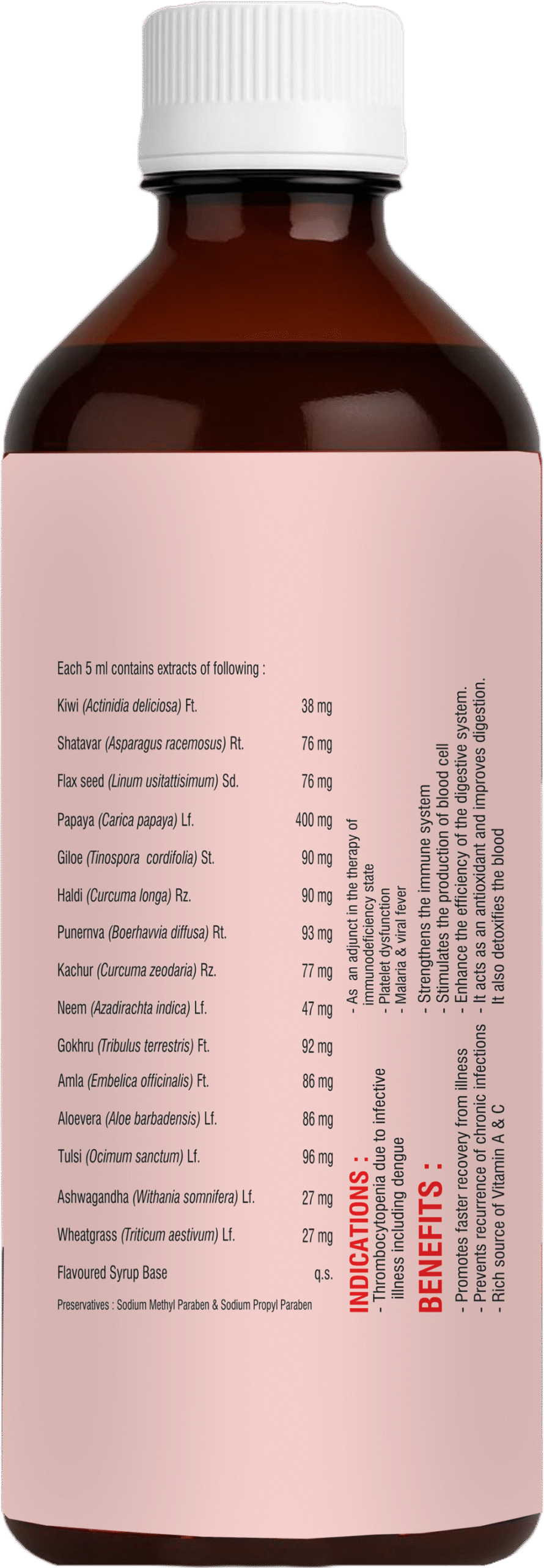 This syrup is especially beneficial during recovery from infections, seasonal illnesses, or conditions where platelet levels may drop. Its unique herbal blend works synergistically to detoxify the blood, promote faster healing, and boost natural immunity without any harmful chemicals or side effects.