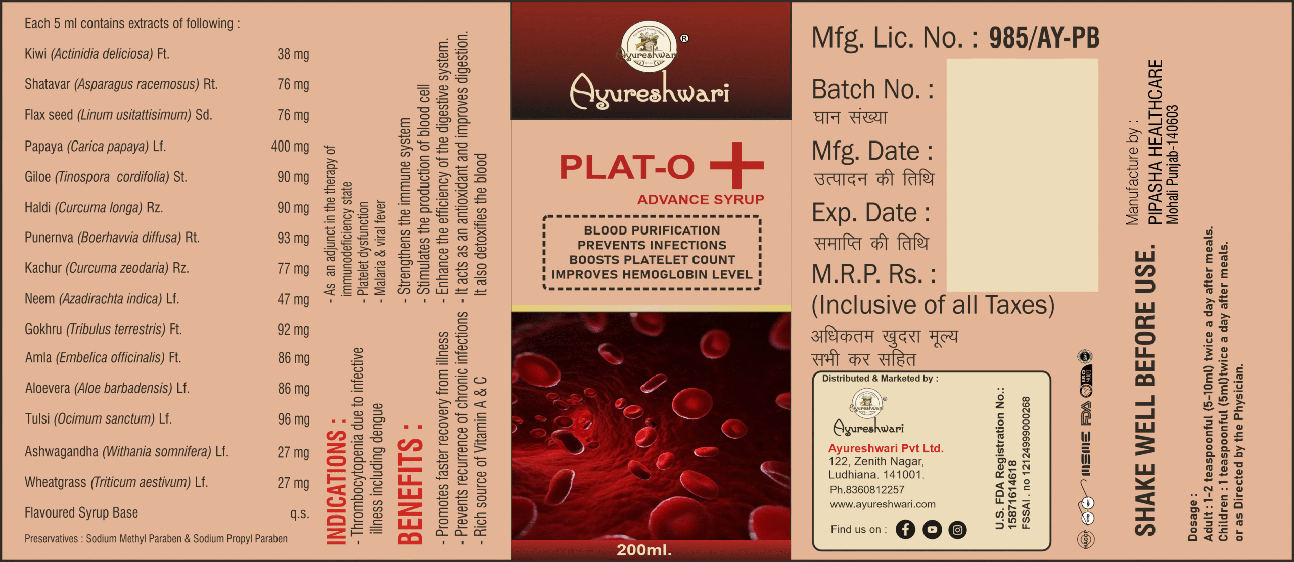 Ayureshwari PLAT-O+ Advance Syrup – Boost Platelet Count, Purify Blood & Improve Immunity (200ml)